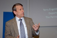 Terry Engelder received his B.S. from Penn State in 1968, his M.S. from Yale in 1972 and his Ph.D in geology from Texas A&M University in 1973. He began teaching at Penn State in 1985, where he received the Wilson Distinguished Teaching Award.[1] He currently teaches there as Professor of Geosciences. Engelder has worked in the past at Columbia University, the US Geological survey, and Texaco. He has also done work as a visiting professor in Italy and Australia. He has received a Fulbright Senior Fellowship award.[2] He has written over 150 research papers in areas relating to the oil and gas industry and has worked with companies including Petrobras, Saudi Aramco, and Royal Dutch Shell.
